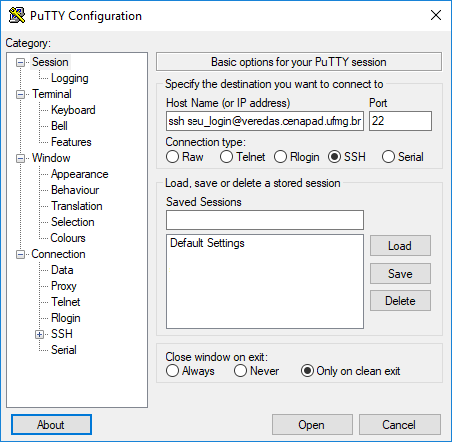Tela do login do software PuTTy utilizado por usuários da plataforma windows para logar remotamente no cluster veredas.