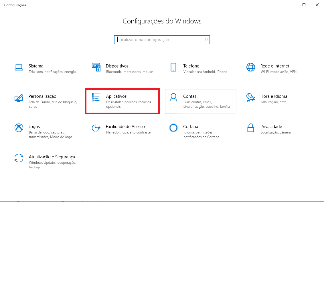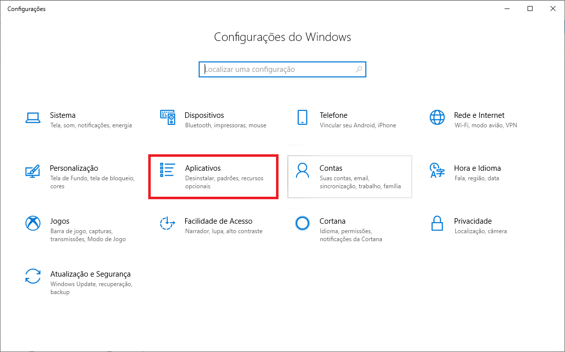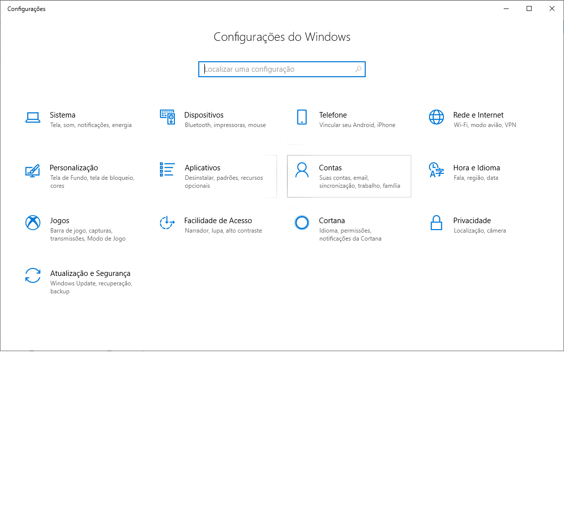 Tela para acessar as configuraçoes do Windows 10.